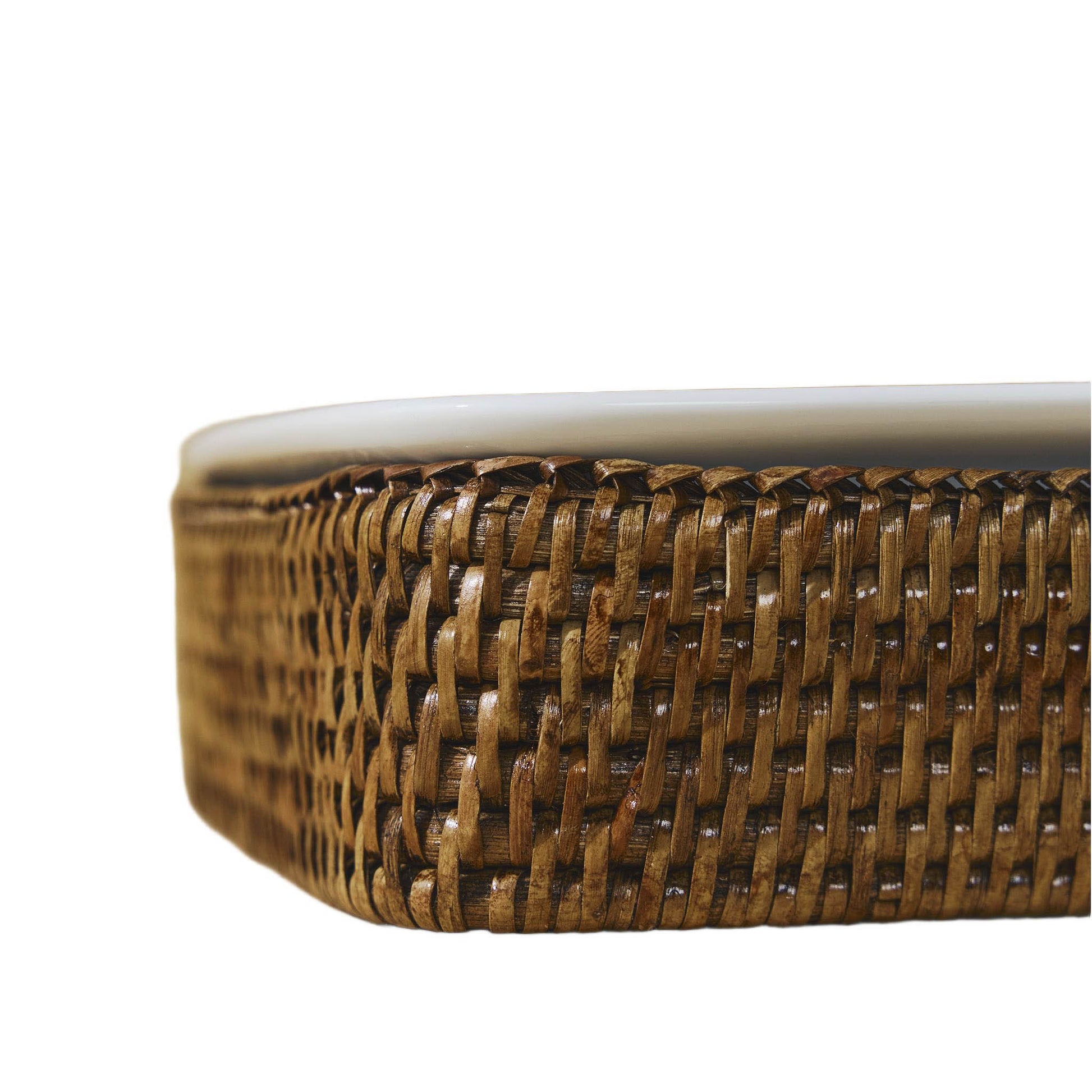 Büyük Dikdörtgen Rattan Fırın Kabı: Sürdürülebilebilir 1. sınıf rattan kullanılarak yapılan bu ürünümüz, Yangon’daki usta zanaatkarların kullandığı geleneksel sıkı el örmesi tekniğiyle yapılmıştır.